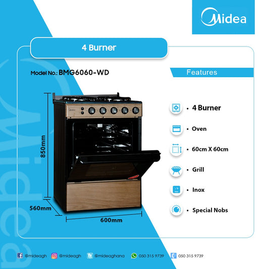 Midea Gas Cooker 60x60cm 4Gas wooden Body (6060-4G057-WD)